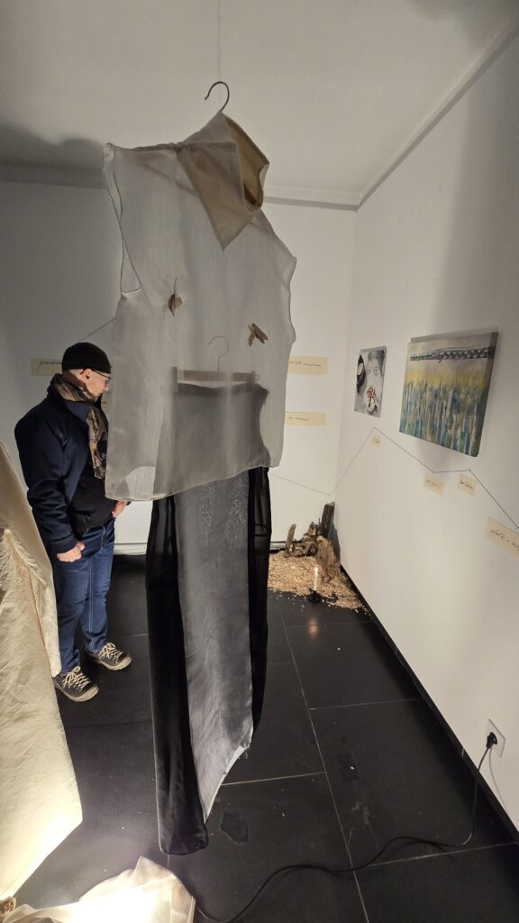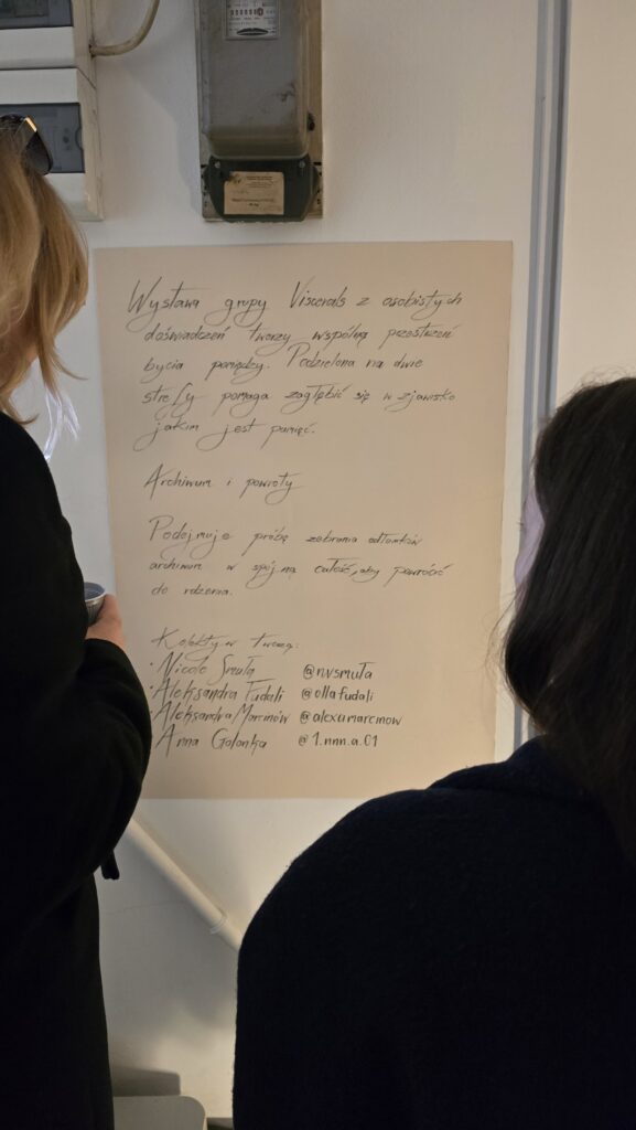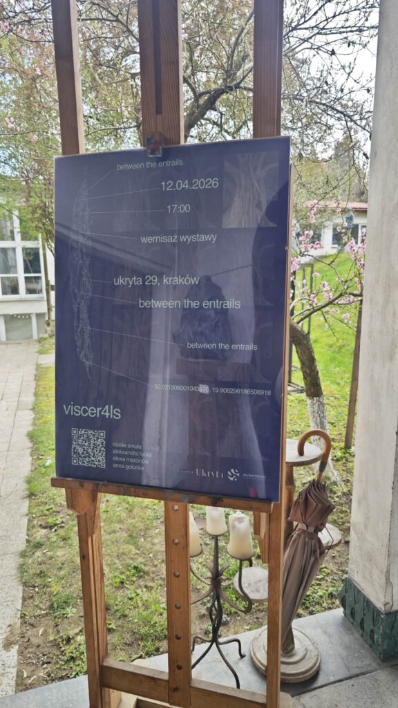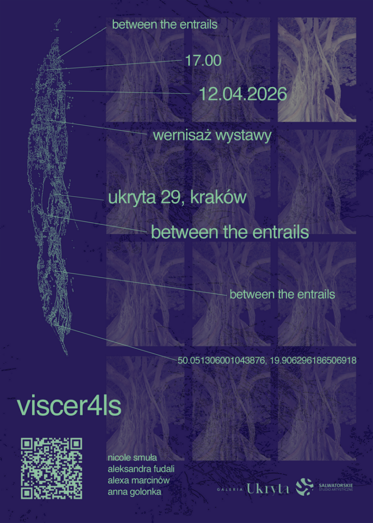 To (oparta na faktach!) historia podróży w poszukiwaniu miejsc zakopanych pomiędzy. Przenosząc się z miejsca na miejsce, artystki odkrywają życie toczące się wewnątrz trzewi świata, a w jego ubytkach znajdują fragmenty przywołujące pamięć. Ciągłe zmiany, dryfowanie w przestrzeni przejściowej, poczucie braku przyciągania zmuszają do poszukiwania punktu zaczepienia. Pędu, który głęboko zakorzeniony umożliwia obranie kursu na powrót. Powrót nie jest tu gestem nostalgii, lecz ruchem niespokojnym i nie linearnym, jednym z etapów podróży. Wystawa grupy viscer4ls z osobistych doświadczeń tworzy wspólną przestrzeń bycia pomiędzy.